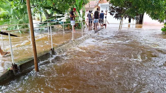 Rio Jatimane transbordou inundando ruas do povoado e trecho da BA 884 cedeu com o volume de água